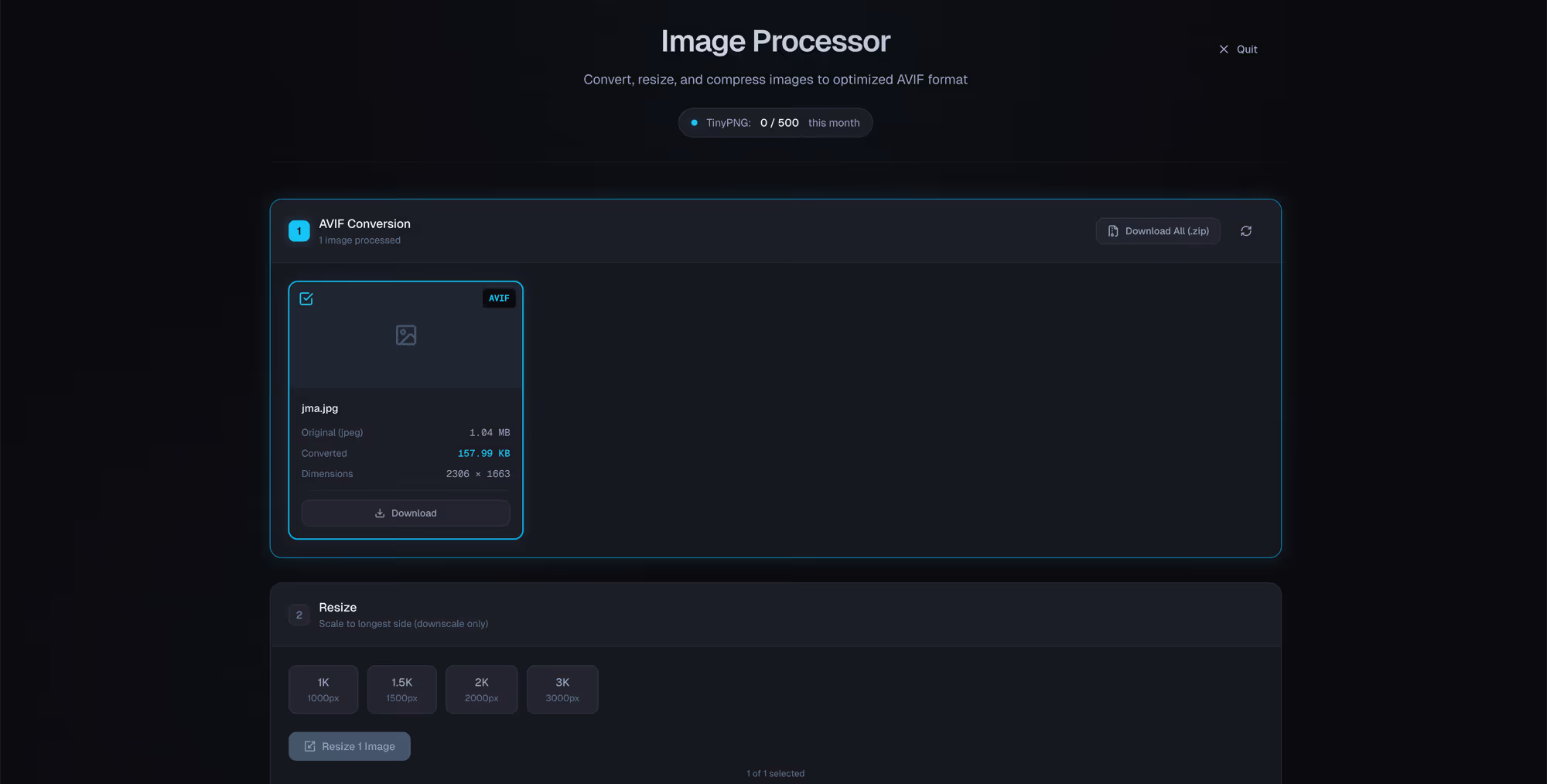 A streamlined internal tool built to make image optimization effortless for web projects. It combines file conversion (including AVIF), resizing, and compression via the TinyPNG API into a single, intelligent workflow, with batch processing for handling entire asset folders at once.